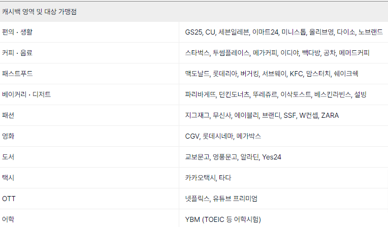 - 드럭스토어(다이소, 올리브영) 1% 캐시백 됩니다. (월 10,000원)